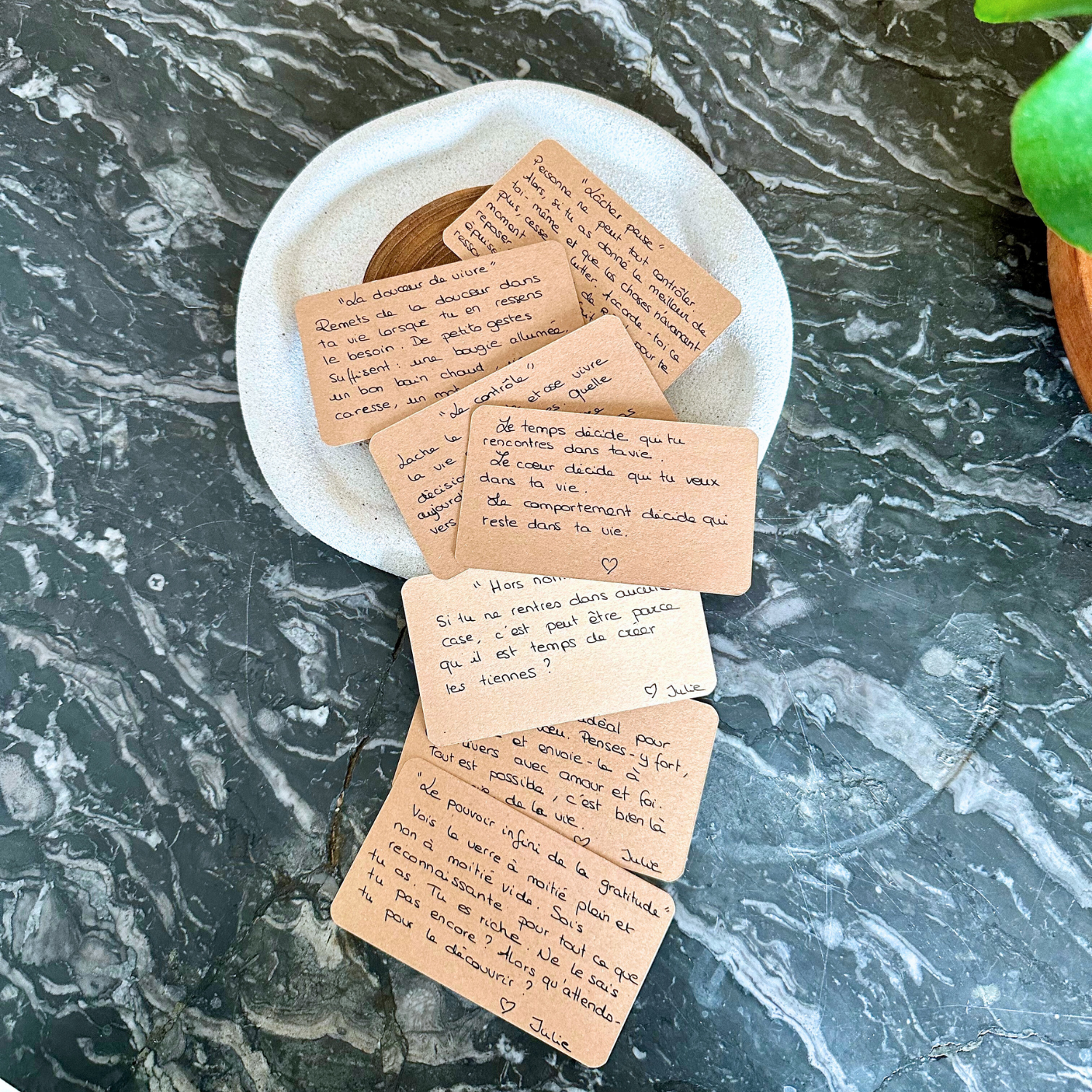 Chaque commande est accompagnée d’un message personnalisé, écrit à la main avec intention et bienveillance. Il peut s’agir d’une citation inspirante, d’un message intuitif, ou encore d’une carte d’oracle, spécialement tirée pour toi.
